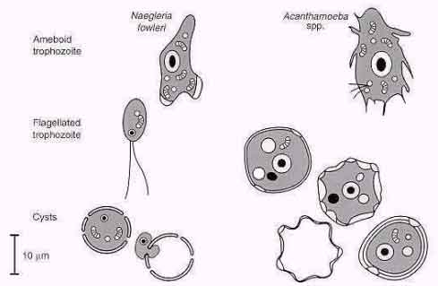 เชื้อทั้งสองชนิดเป็นอะมีบ้าที่อาศัยอยู่อย่างอิสระ (Free living) ขนาดประมาณ 7-20 ไมโครเมตร