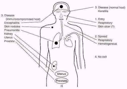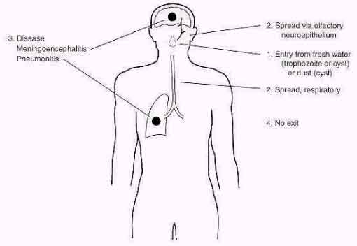 ที่มีเชื้อปะปนอยู่ เข้าสู่ระบบประสาทในจมูก (Alfactory nerve) และเข้าสู่สมอง ส่วนเชื้อ Acantamoeba อาจเข้าสู่ร่างกายทางผิวหนัง ปอด เยื่อบุตา (จากการใส่คอนแท็คเลนส์
